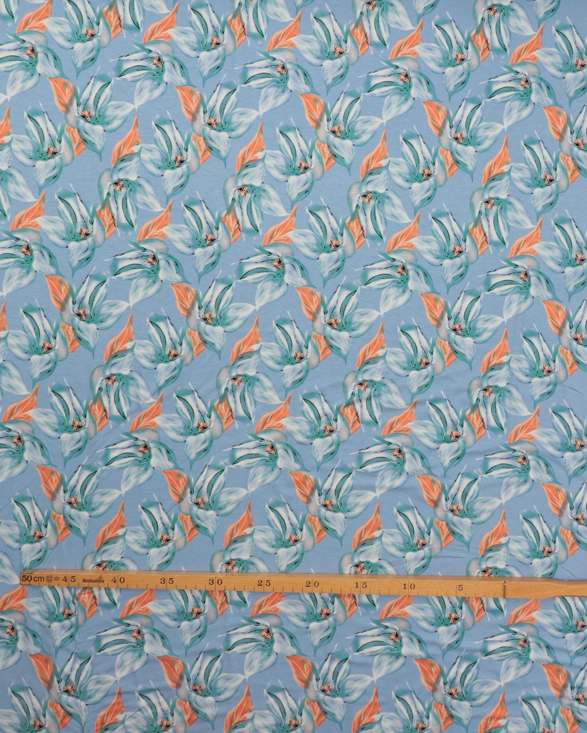Blå bund med blomster – Viskose jersey