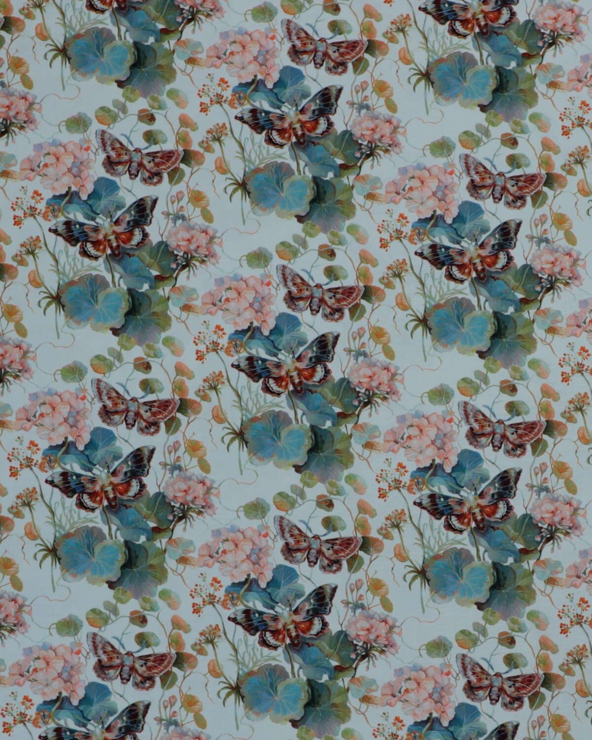 Lyseblå bund med blomster i bl.a grønne og blå nuancer.