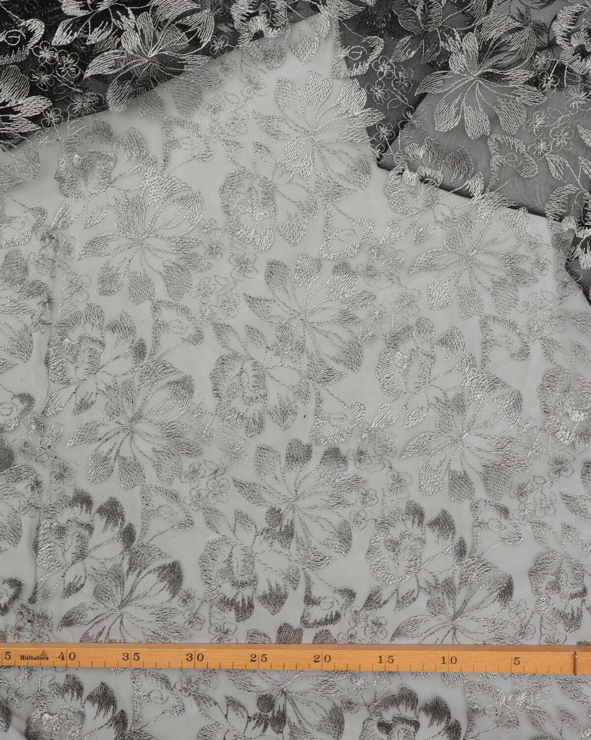 Grå/mat sølv broderi på sort brudetyl