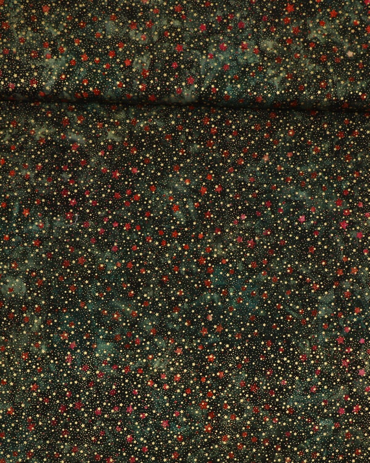Røde og guld stjerner på en mørkegrøn meleret bundfarve.