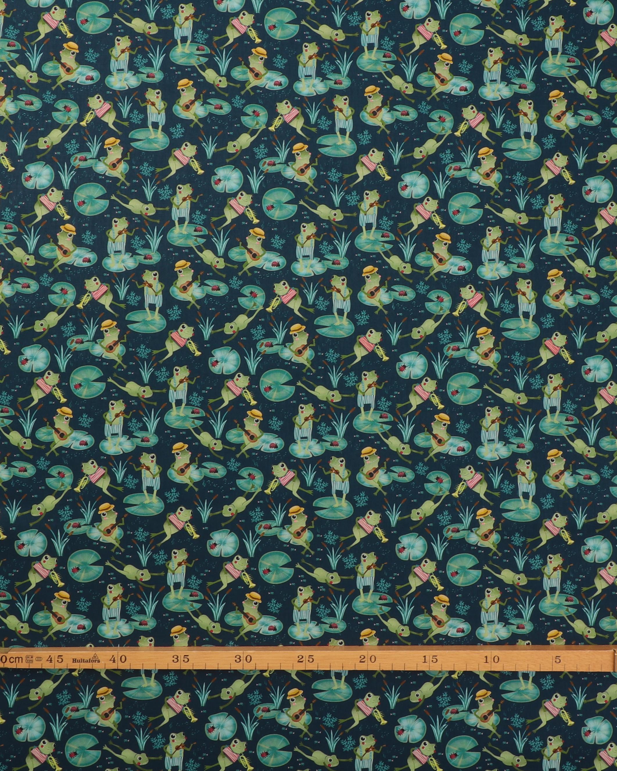 Lake night serenade, frøer på blå bund – Patchwork