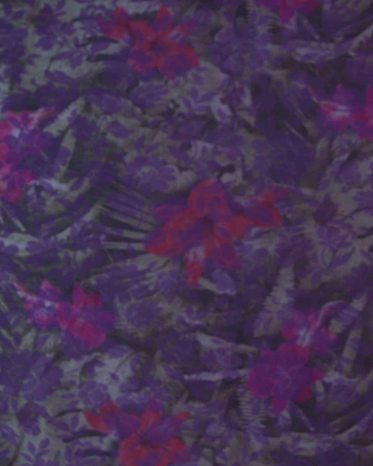 Lilla blomster, lidt rød og grønne nuancer. Kvaliteten er lidt kraftigere end silkechiffon-