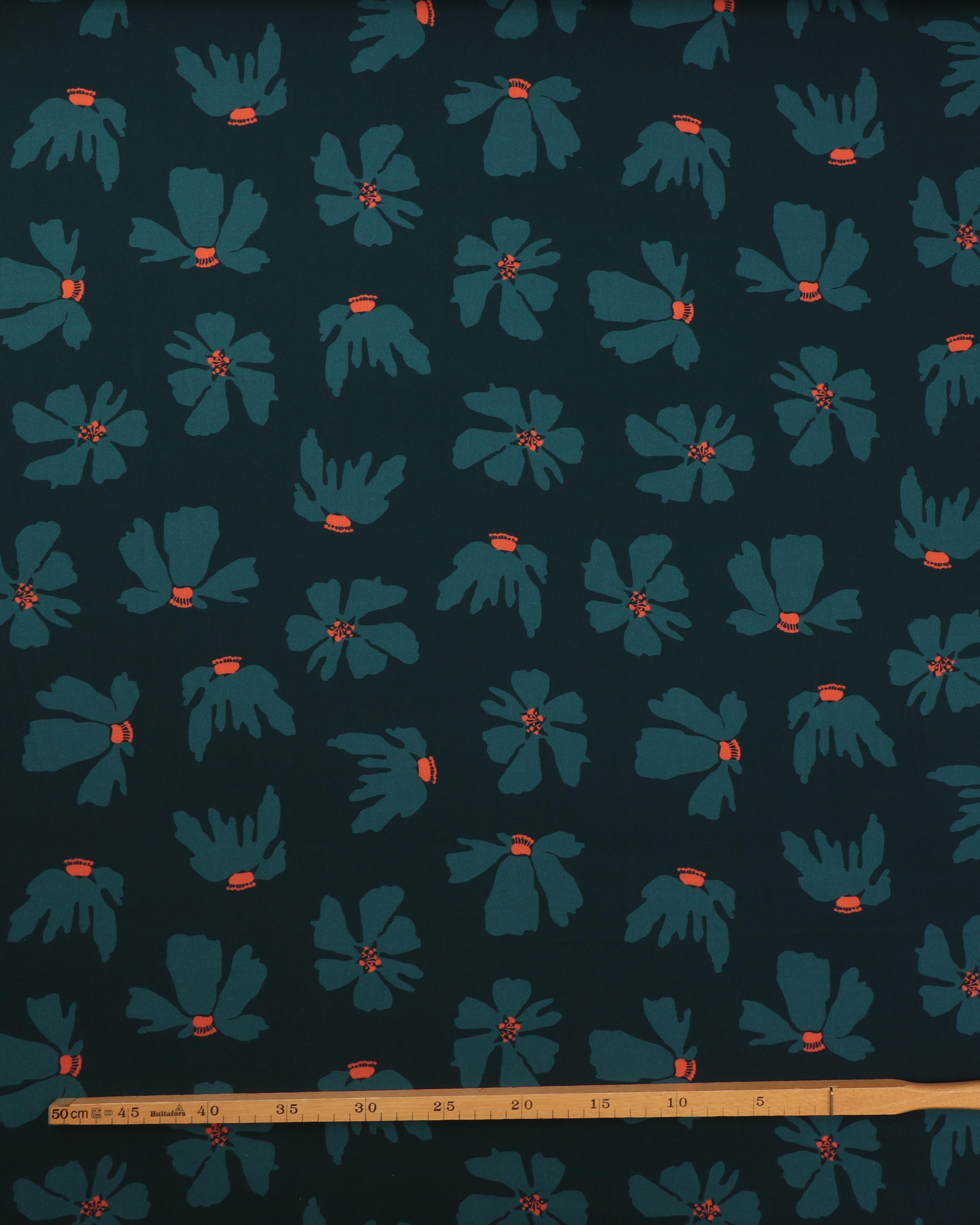 Mørk petrol med petrolfarvet blomster – Twillvævet viskose