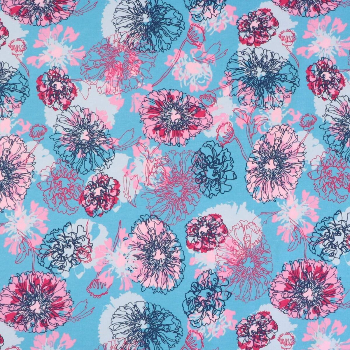 Turkis bundfarve med blomster i cerise og lyserød. Omrids af blomster tegnet med marineblå og pink