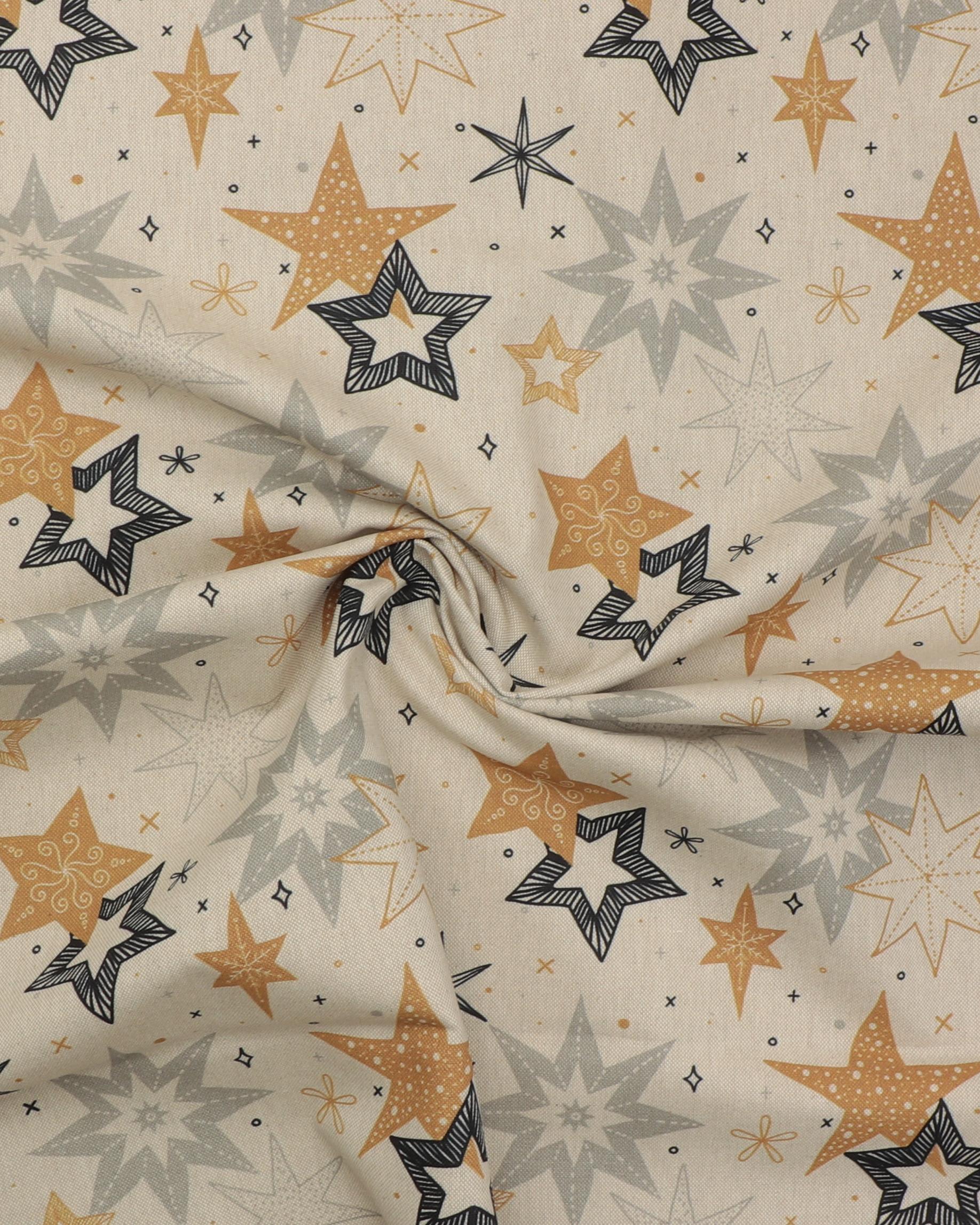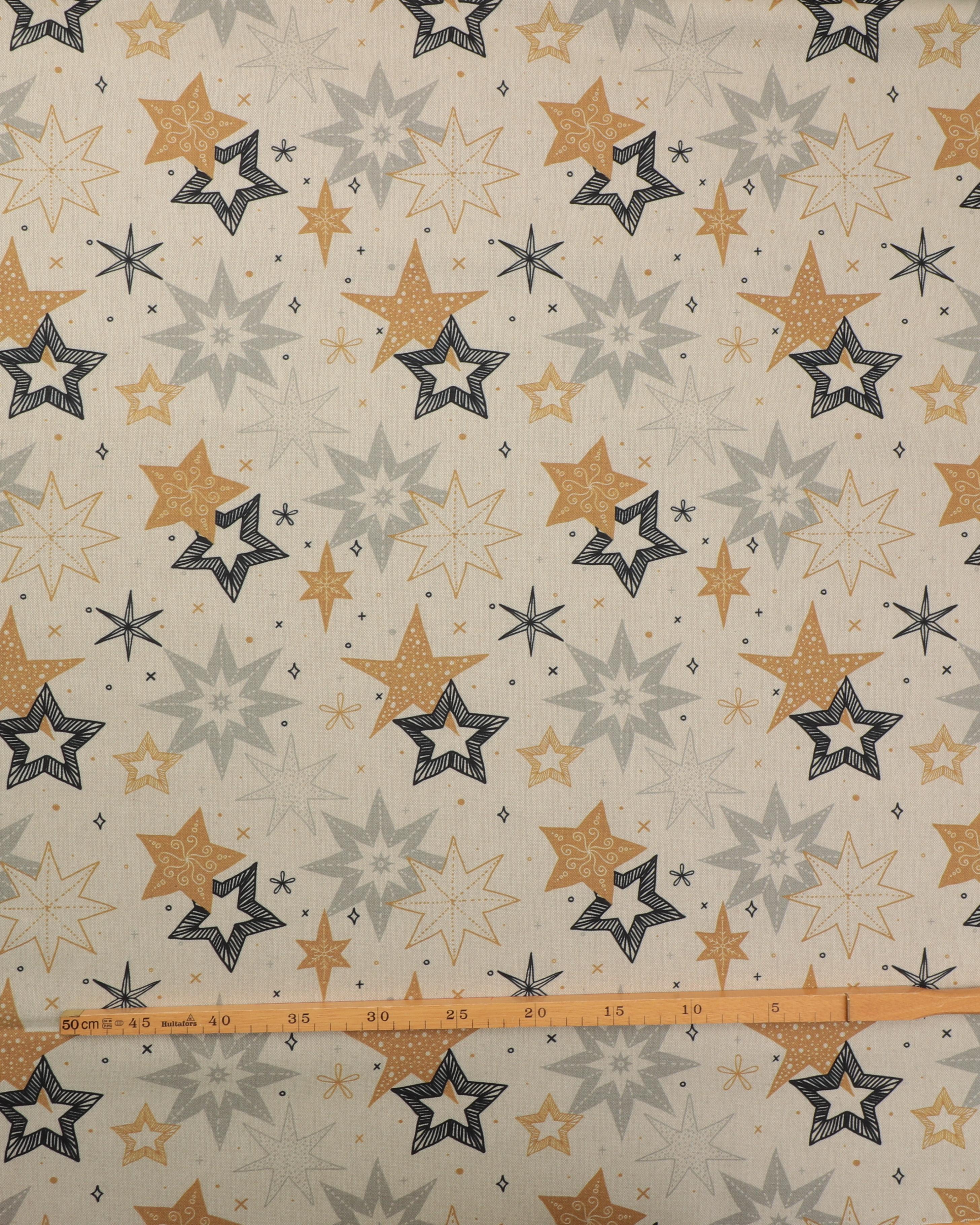 På den lyse naturfarvet bund er stjerner i grå, karry og sort. Fin metervarer til dug til julebordet